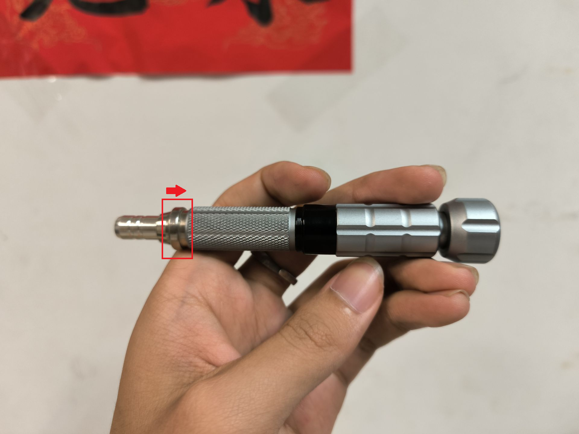 工作室部署的螺丝刀套件一般是可以伸缩的,将如图所示的部分向该方向拨动,即可调节螺丝刀前部的长度。